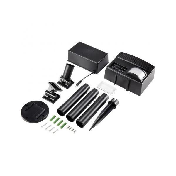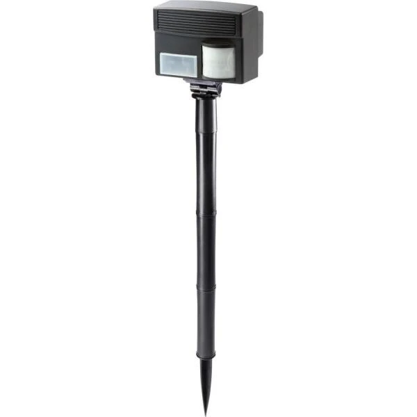 Isotronic Ultrasone verjager voor honden, katten en vossen. Honden katten, vossen en andere ongewenste indringers worden door ultrahoge tonen verjaagd van zodra ze door de detector worden opgemerkt. Deze verjager werkt op batterijen of een 12V DC adapter, beiden niet meegeleverd. Er kunnen drie verschillende frequenties worden ingesteld: 17, 23 of 40 kHz en dit constant of met een interval van 5 seconden.